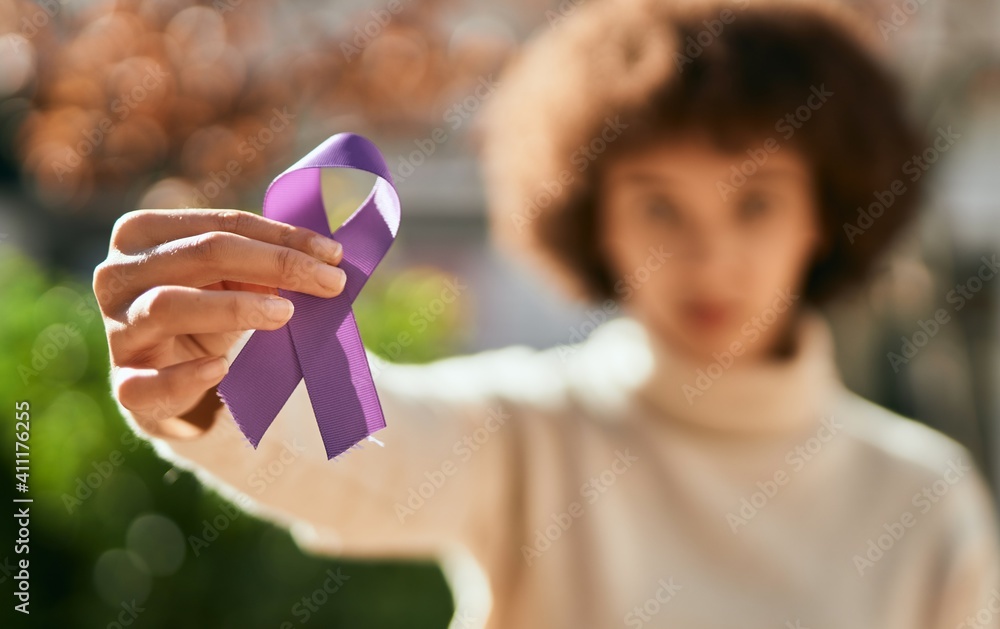 Young hispanic girl with serious expression holding purple awareness ribbon at the city.