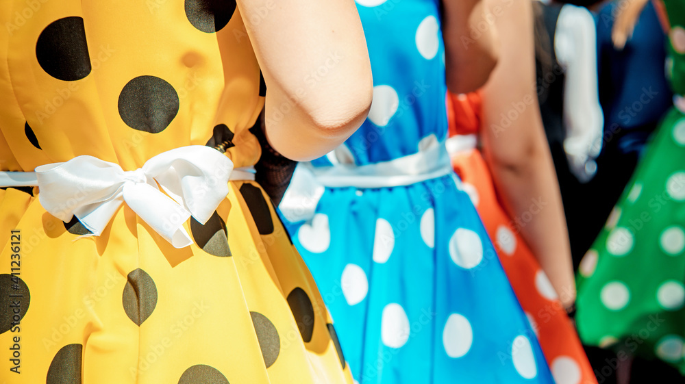 Group of teen girls in multicolored dresses with polka dots. Retro fashion style.
