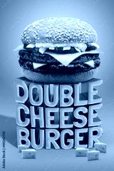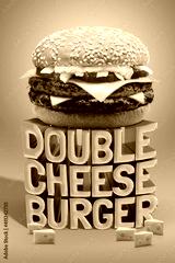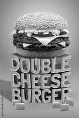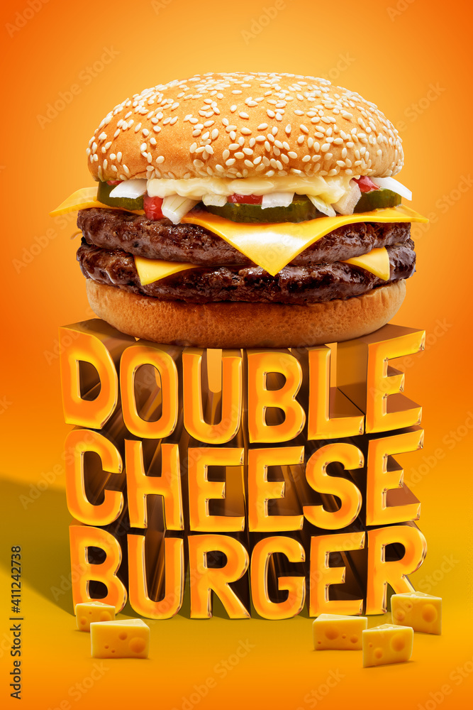 Delicious Double Cheese Beef Burger consists of Bun Bread, Patty, Pickle, Onion, Mayonaisse, Ketchup and Cheddar Cheese in a yellow background, with interactive 3D text for Modern Fast Food Restaurant