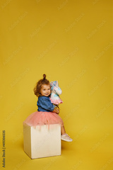 Happy little girl in pink skirt and denim jacket with a toy horse over the yellow background