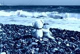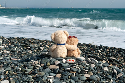 Two teddy bears in love on the beach