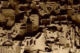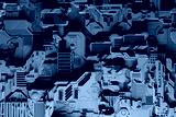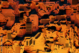 Detail of a futuristic machine. 3D illustration of a futuristic wall made of various details under yellow neon lights. Cyberpunk background. Industrial wallpaper. Grunge details