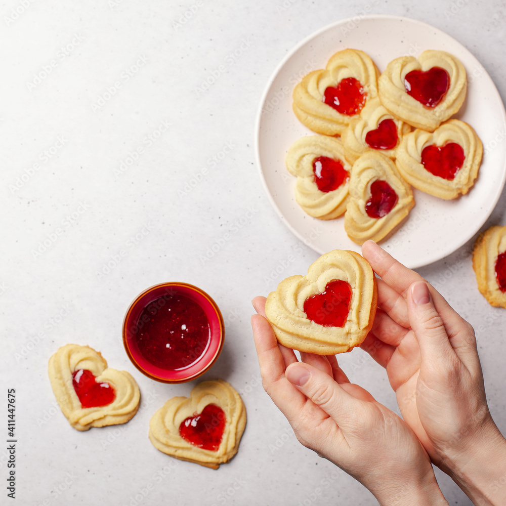 A woman holding a homemade heart-shaped cookie with strawberry center. White background, copy space, Square format.
