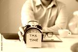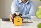 Businessman With Tax Time Reminder Note On Alarm Clock