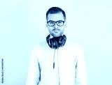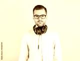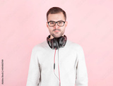 Serious young cute kid listening to music in big white headphones on pink background, in white sweatshirt, world dj day