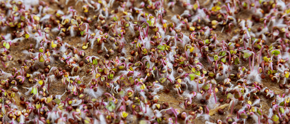 Sprouted seeds on linen mats for growing microgreens. Home grown micro greens in a plastic container.