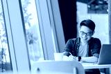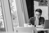 Smart attractive positive asian business male wearing glasses work remote new normal lifestyle hand use laptop tele conference onlive videocall meeting remote business ideas concept