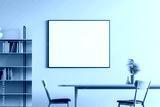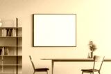 Dining room interior with a wooden floor, a table with chairs and a framed horizontal poster above it. mock up