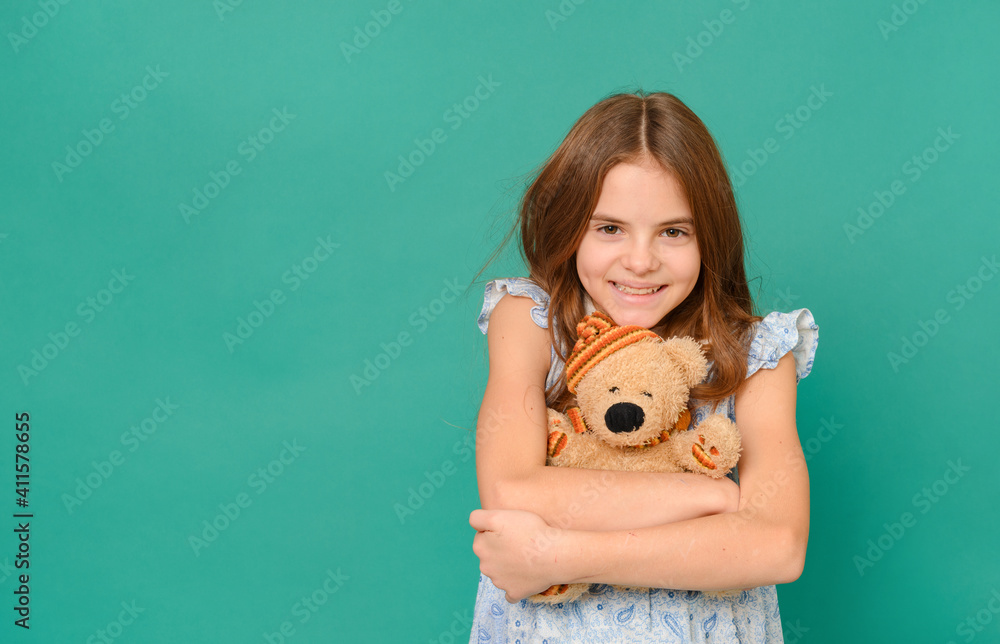 white teenage girl 10 years old hugs a toy bear and smiles on a green background