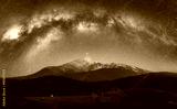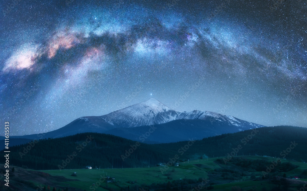 Arched Milky Way over the beautiful mountains with snow covered peak at night in summer. Colorful landscape with bright starry sky with Milky Way arch, snowy rocks, hills. Galaxy. Nature and space