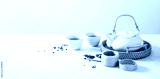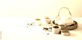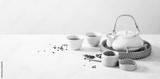 Asian tea concept mockup, two white cups of tea and teapot surrounded with green dry tea with space for a text on light background. Wide banner.