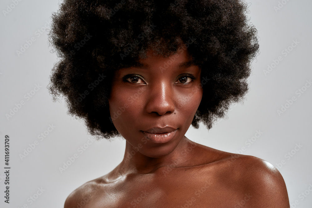 Close up portrait of stunning african american young woman with afro hair and perfect smooth glowing skin looking at camera while posing isolated over gray background