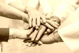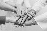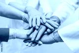 Team of young doctors stacking hands in blue gloves indoor. medical teamwork.