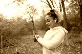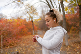 Fit woman in sportswear uses a smart bracelet in the autumn forest. Heart rate monitoring