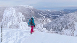 CLOSE UP: Woman observes the stunning winter landscape before snowboarding.