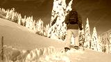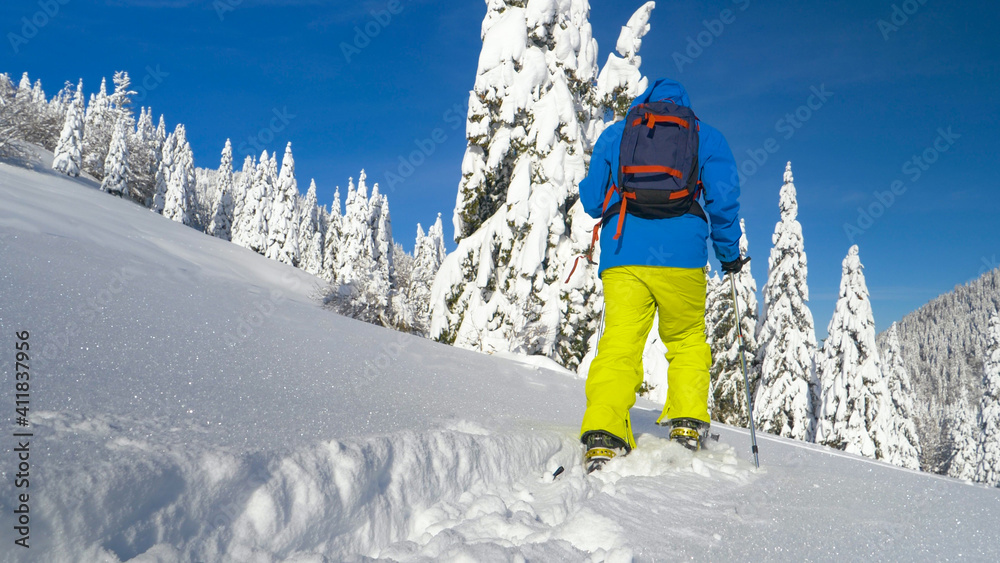 LOW ANGLE: Active man on a ski touring adventure crosses untouched snowy meadow.