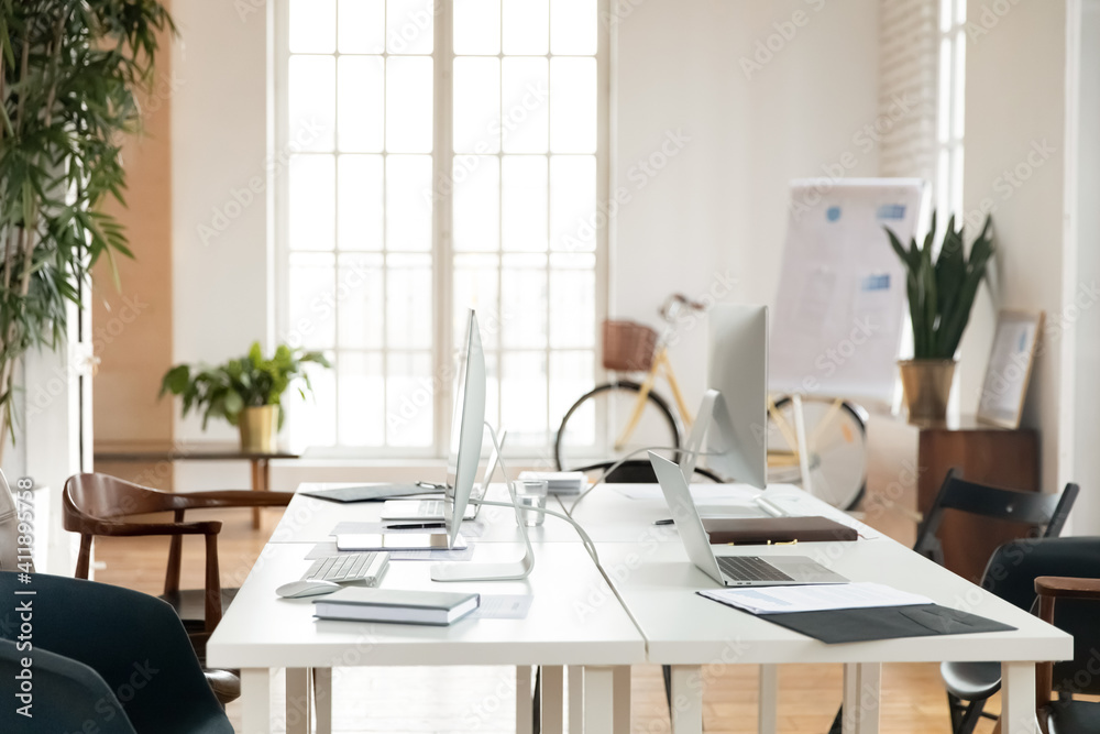 Empty office space for small team working together at table with laptops and computers. Meeting room with shared desk, workplaces and houseplants. Modern business loft interior with no people.