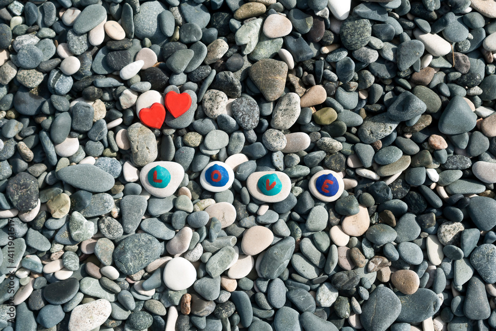 Word Love and two red hearts on beach stone background