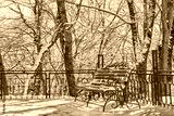 Beautiful melted snow covered bench with openwork patterns in the Zheleznovodsk Park, Russia.
