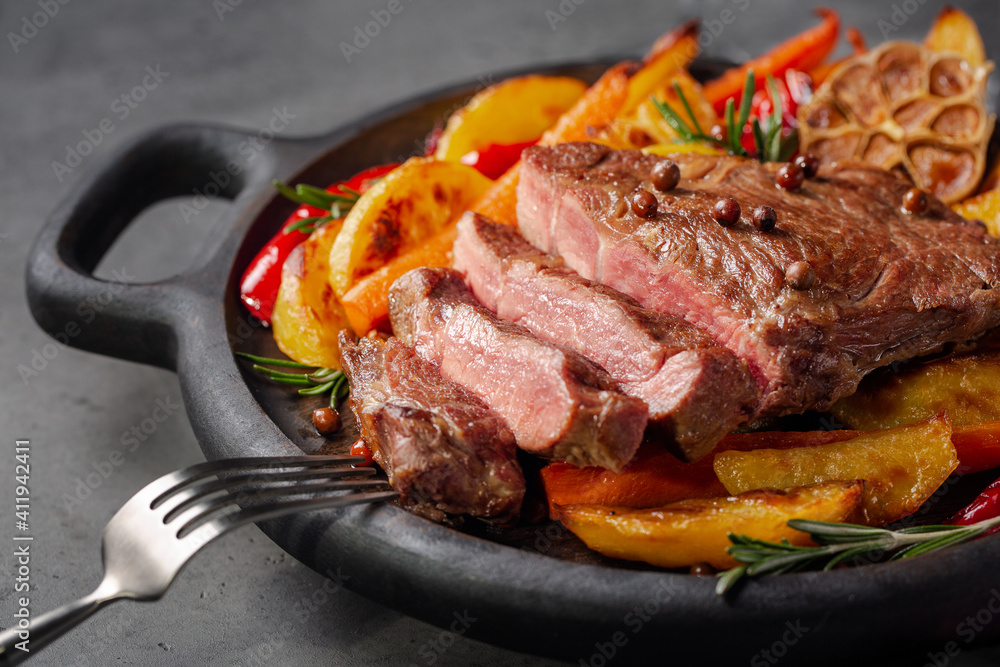 Piece of cooked beef steak with spices served on black wooden cutting board with vegetables: baked potatoes, carrots, bell pepper, garlic and rosemary.