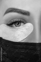 Eyelash Extension Procedure. Beautiful Woman with Extreme Long False Eyelashes. Makeup, Cosmetics. Beauty, Skincare. Woman in medical mask.