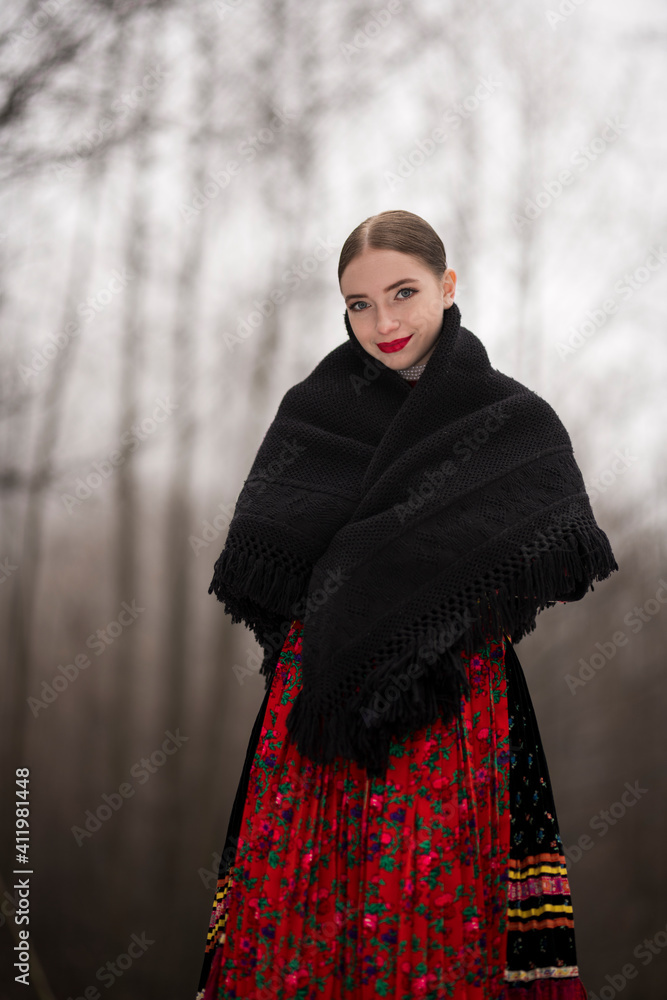 Young beautiful slovak woman in traditional dress. Slovak folklore