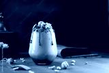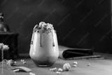 Sweet Milkshake with caramel syrup,cream liqueur,caramel popcorn and chocolate powder on brown background with vintage,manual coffee grinder.