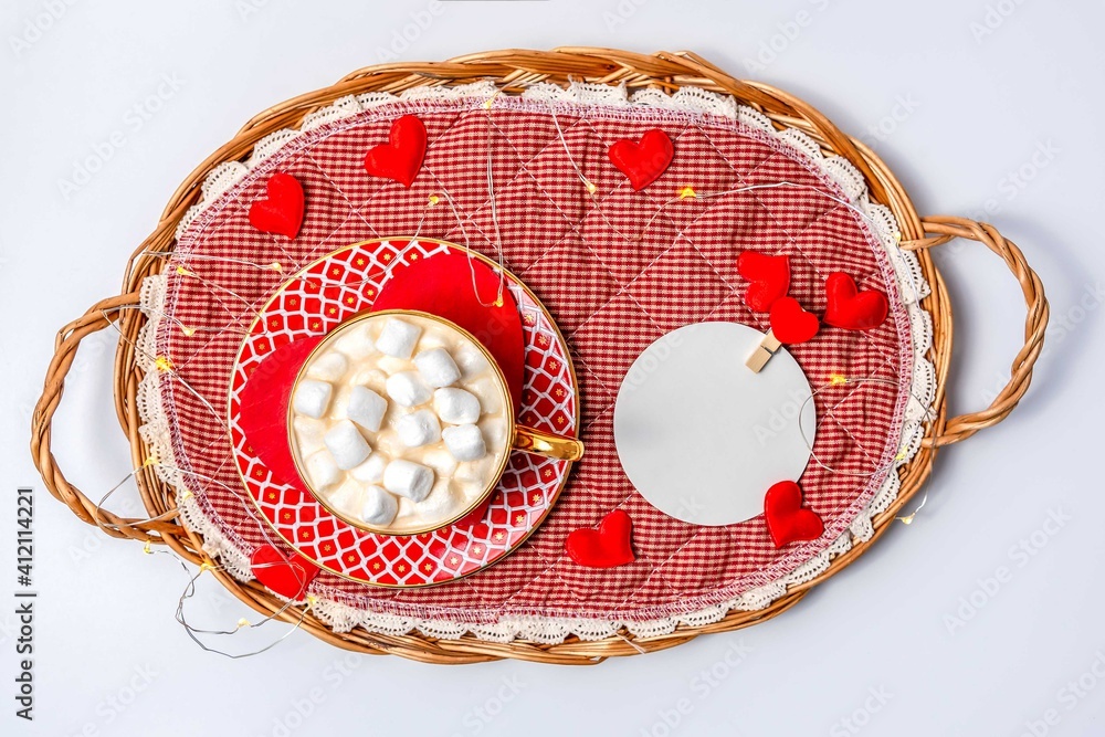 B raided tray with cup of cocoa with marshmallow. Decorated with small hearts, garland and round blank for your text.