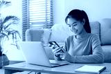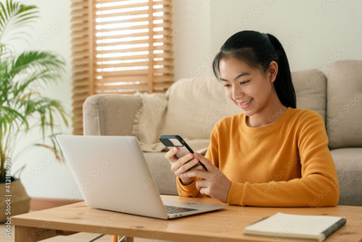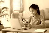 Beautiful Asian women wear long sleeve yellow using text message mobile phone