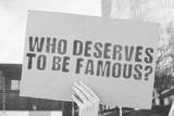 The question " Who deserves to be famous? " on a banner in hand with blurred background. Celebrities. Popular. Social media. Promotion. Influencer. Impact. Advertising. Success. Money. Earnings