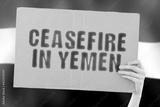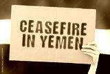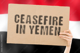 The phrase " Ceasefire in Yemen " on a banner in men's hand with blurred Yemeni flag on the background. Politics. Escalation. Conflict. Battle. Confrontation. Blast. Attack. War. Discretion