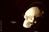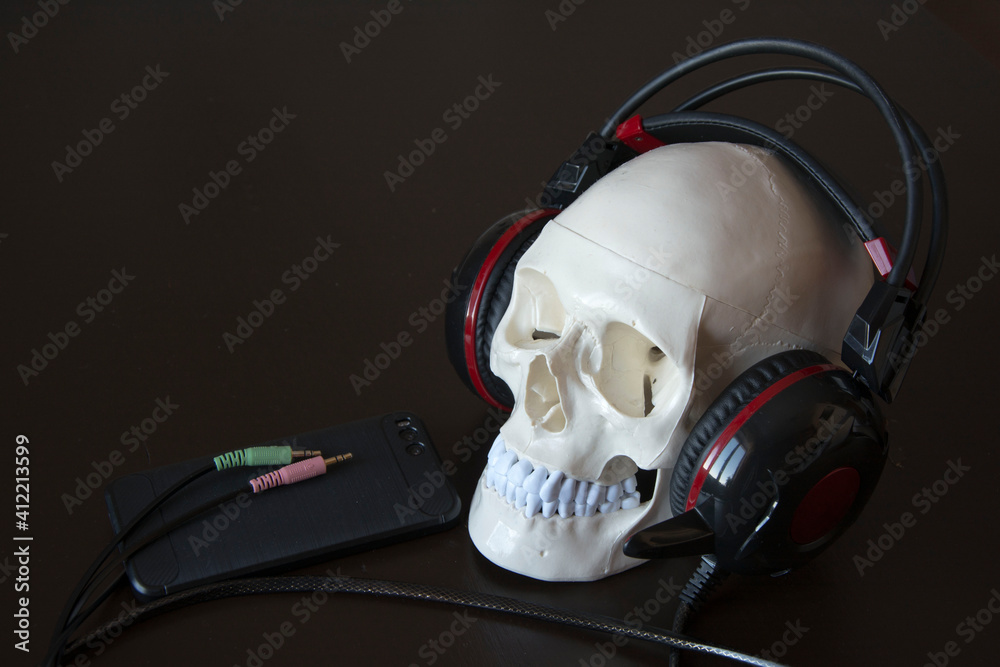 Skull in headphones listens to music on smartphone