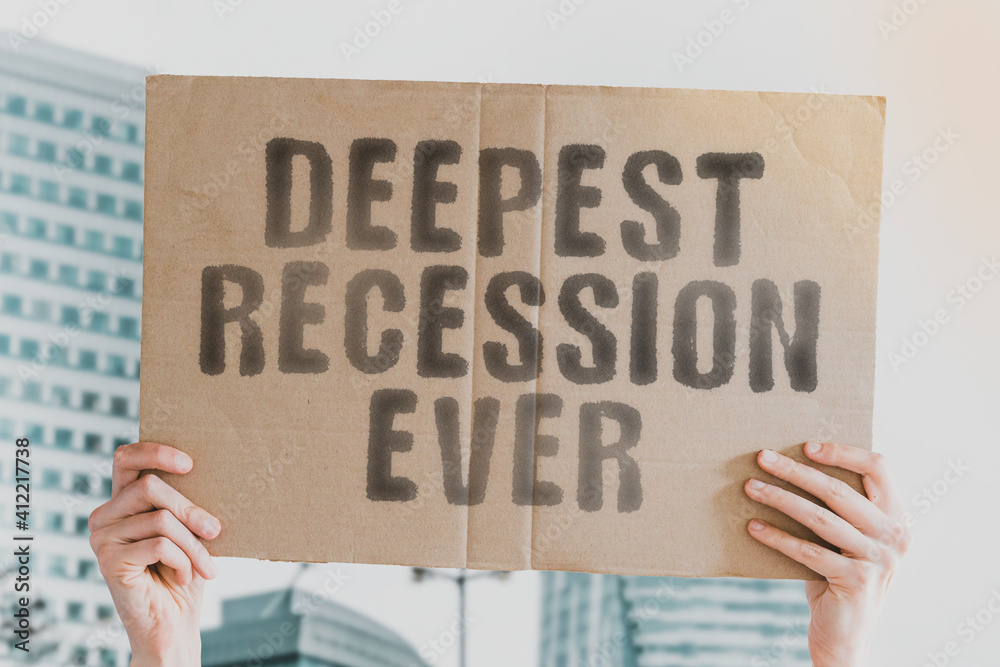The phrase " Deepest recession ever " on a banner in hand with blurred background. Deterioration. Decay. Wages. Stability. Monetary. Earning. Desperation. Revenue. Profit. Lose. Industry