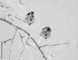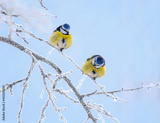 two birds of the blue tit sit on the branches covered with white frost in the winter garden