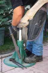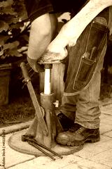 Farrier hoof-worker blacksmith grating the horse's hoof