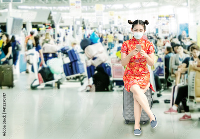 asian woman in cheongsam Chinese Tradition suite with traveller bag