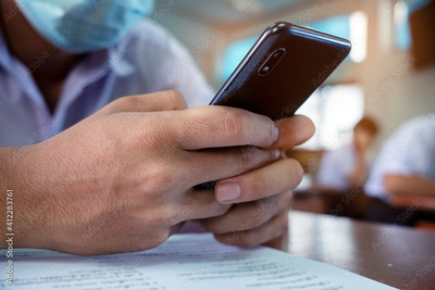 Uniform students are test exam and study online by using smartphone and wearing protective facemask in classroom