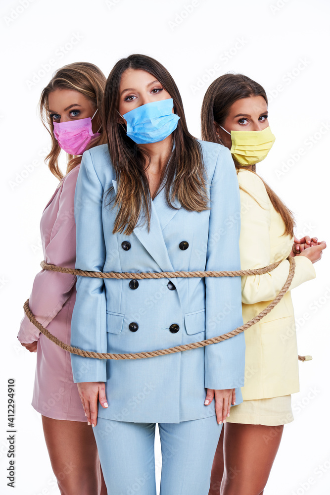 Three women in pastel suits posing over white background