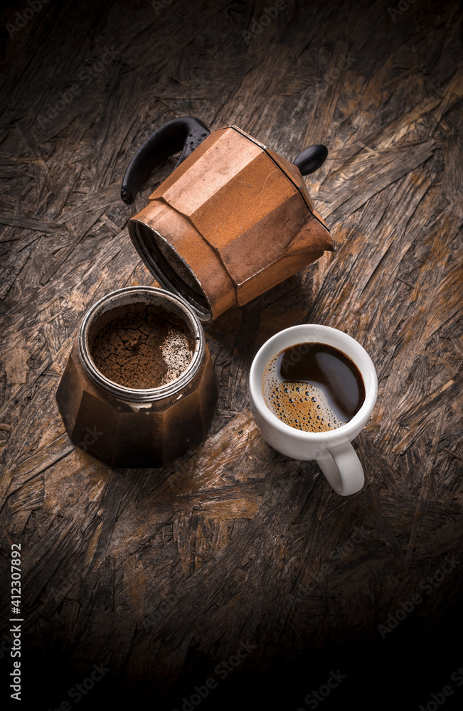 Fresh coffee mug and moka pot disassembled overhead arrangement on dark rustic background studio shot