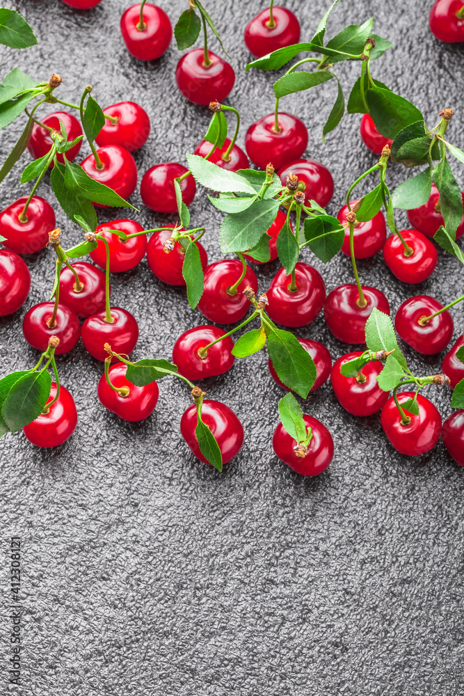 Sour cherries with green leaves fresh vibrant arrangement on rustic shiny black kitchen table studio shot