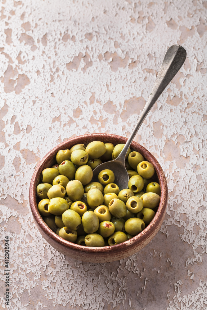 Olives in crockery jar vibrant arrangement with metal spoon top down on old rustic white wooden table background studio shot