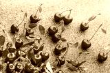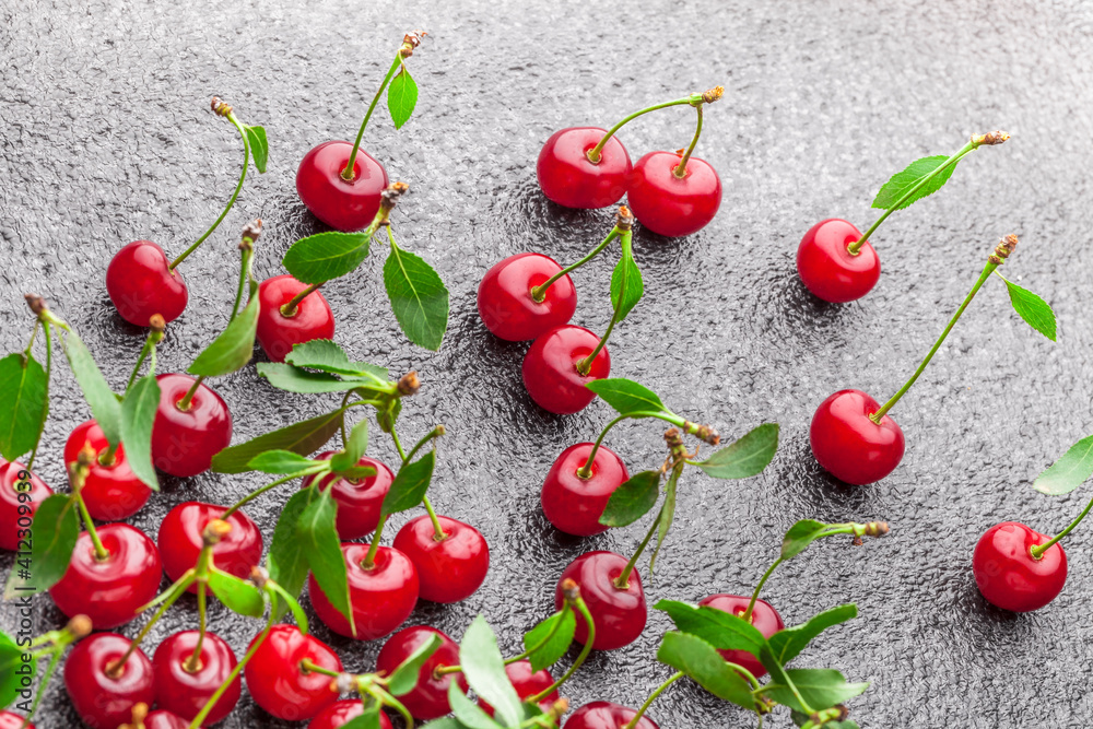 Sour cherries with green leaves overhead fresh vibrant color arrangement on gray shiny background