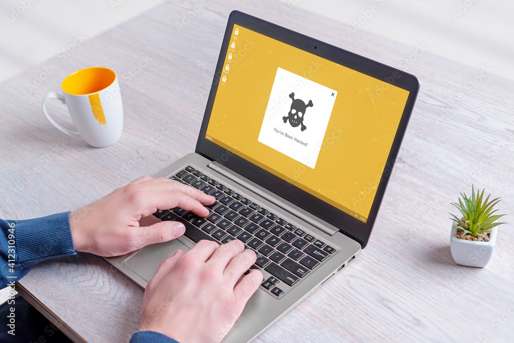 Hacked laptop computer with pop-up message on desktop concept. Man work on computer