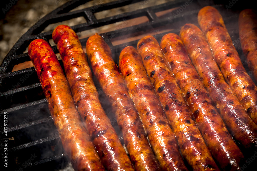 Grilled sausages colorful outdoor arrangement with smoke and barbecue grill marks overhead shot