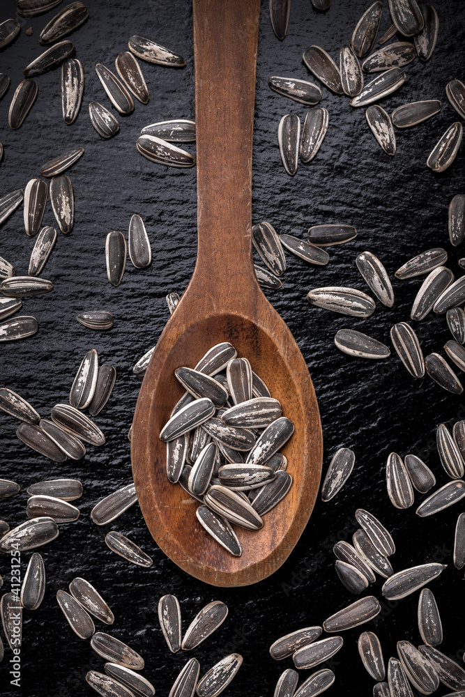 Sunflower seeds large overhead close-up arrangement in old wooden spoon on black shiny stone table studio shot