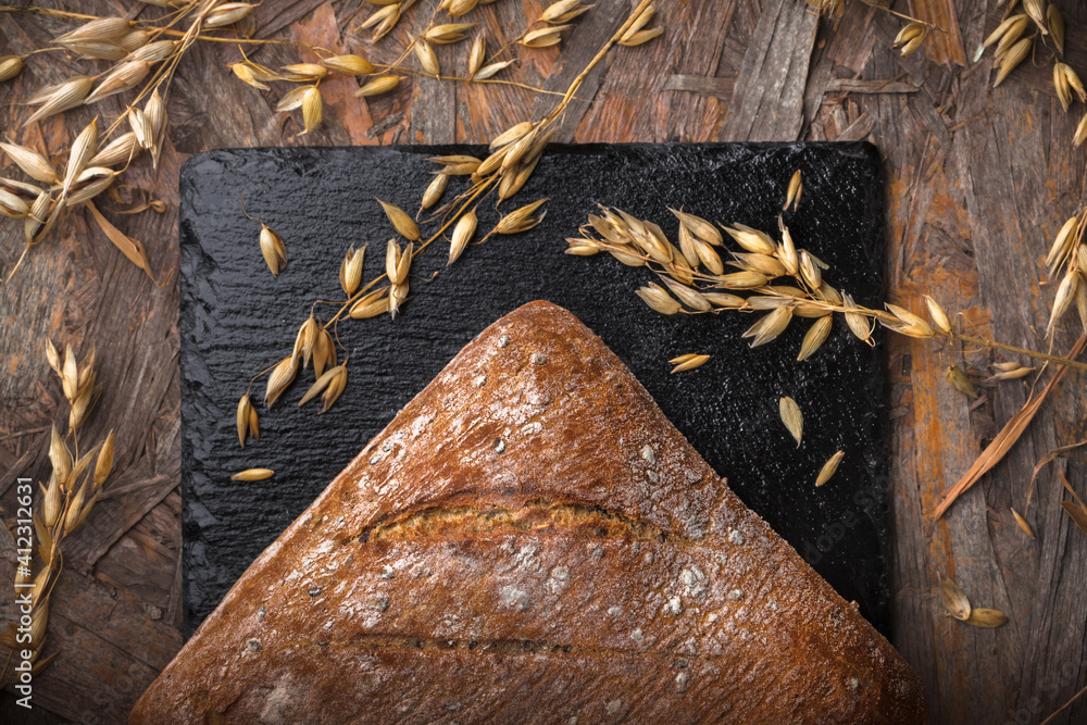 Wholegrain bread arrangement on shiny cutting board and wooden table