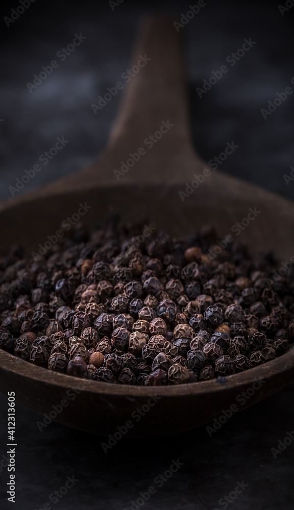 Black pepper selective focus close-up front view arrangement in old brown rustic wooden spoon on dark background studio shot