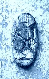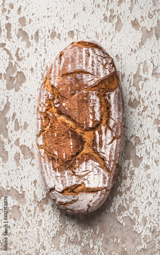 Whole grain bread home made loaf overhead with cracked crust texture on white rustic wooden table in bakery studio shot
