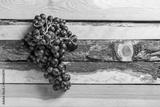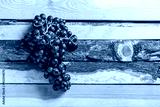 Red grapes overhead branch vibrant arrangement with copy space on old rustic wooden table studio shot