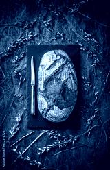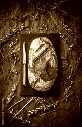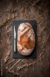 Wholegrain rustic bread overhead arrangement with kitchen knife on black stone board and wooden table with rye and wheat stalks studio shot
